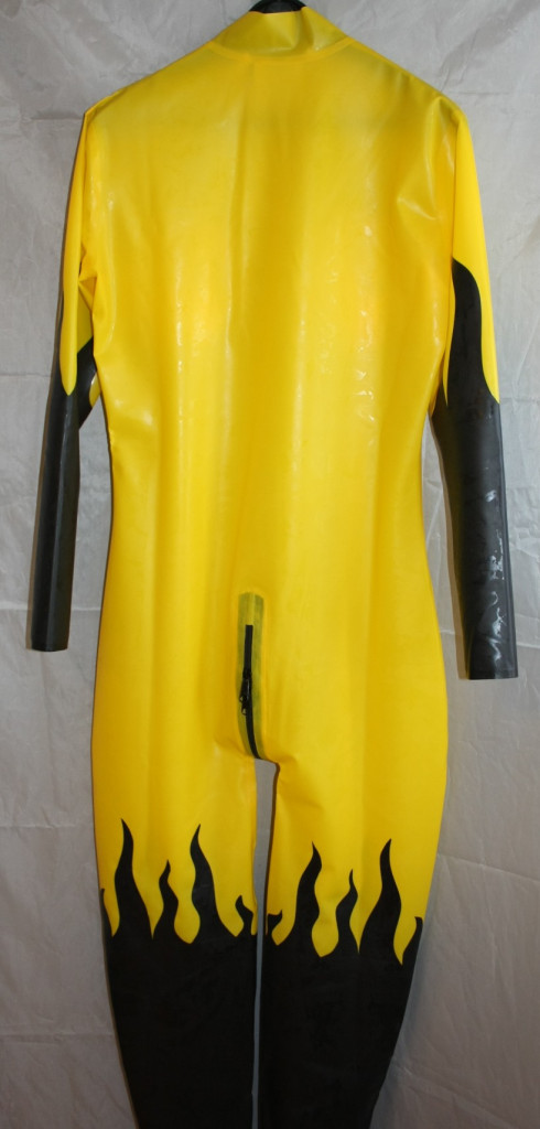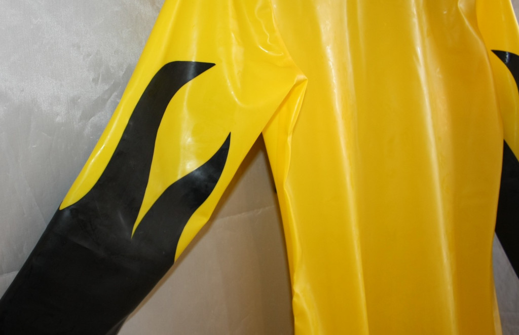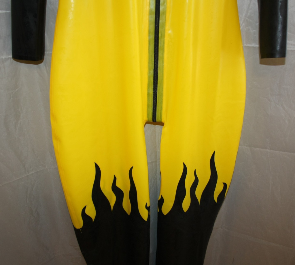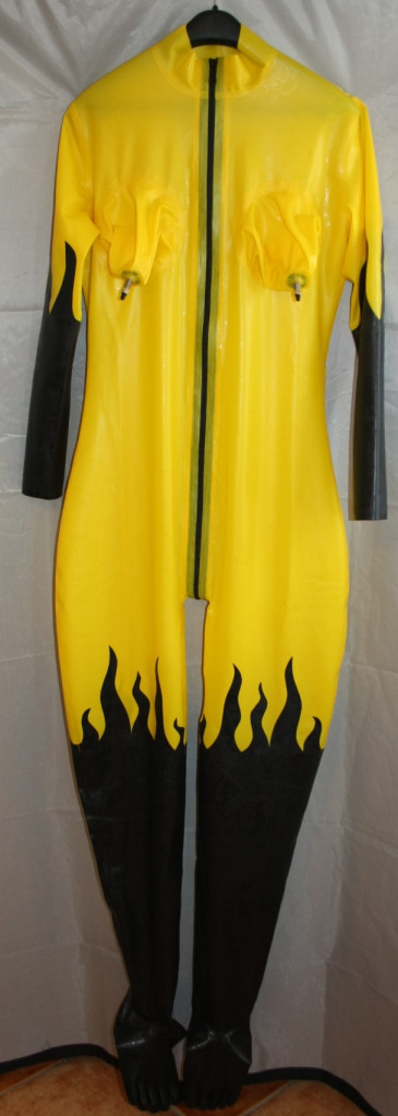 Catsuit citrom/fekete színben tűzlángokkal és felfújható mellekkel.